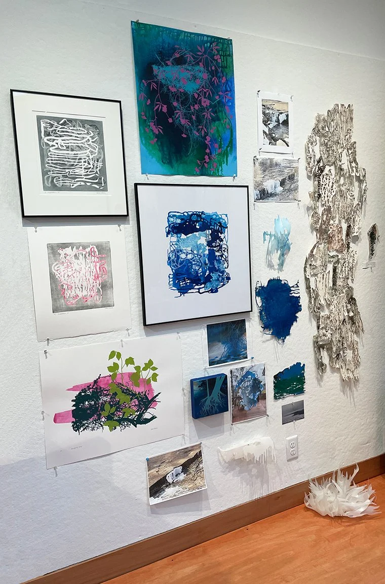 An assortment of prints, paintings, assemblages, inspirational photos, and idea pieces on my studio wall.